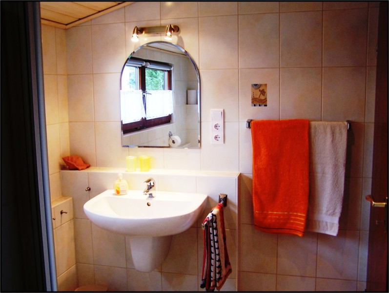 Unser Bad mit Tageslicht ist komfortabel und geräumig, mit ebenerdigem Eingang zur Dusche.